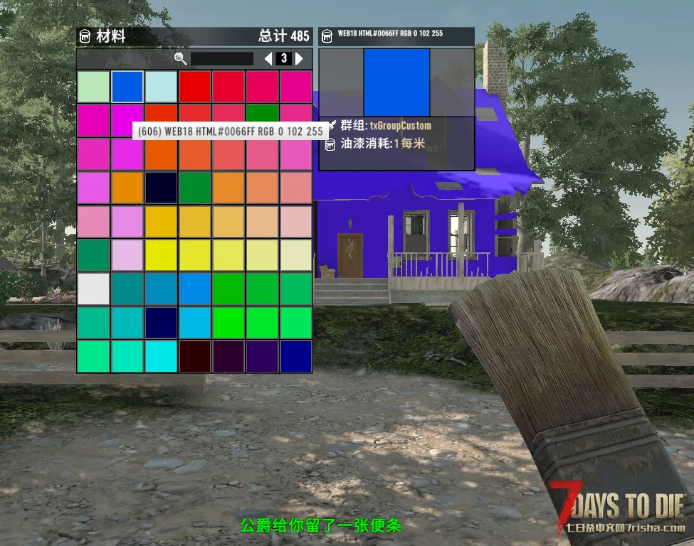 本MOD包含WEB安全色216色,配合本人另外一款油漆材质“原创-油漆材质V2.5-my_paint_xrite_ccc爱色丽标准24色+12扩展色+2纯黑白 – 七日杀V2.X模组下载 – 七日杀中文网”,已能满足日常着色使用。